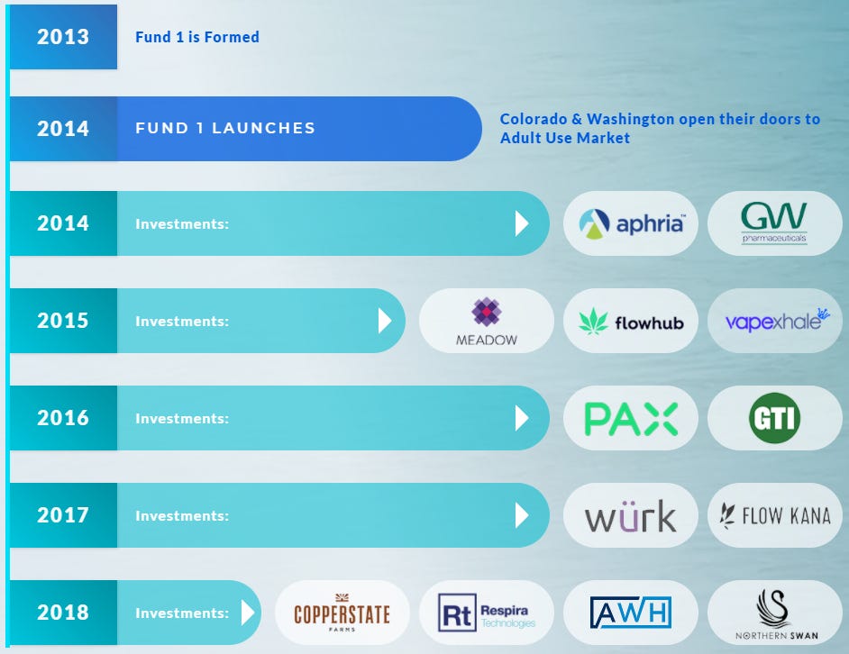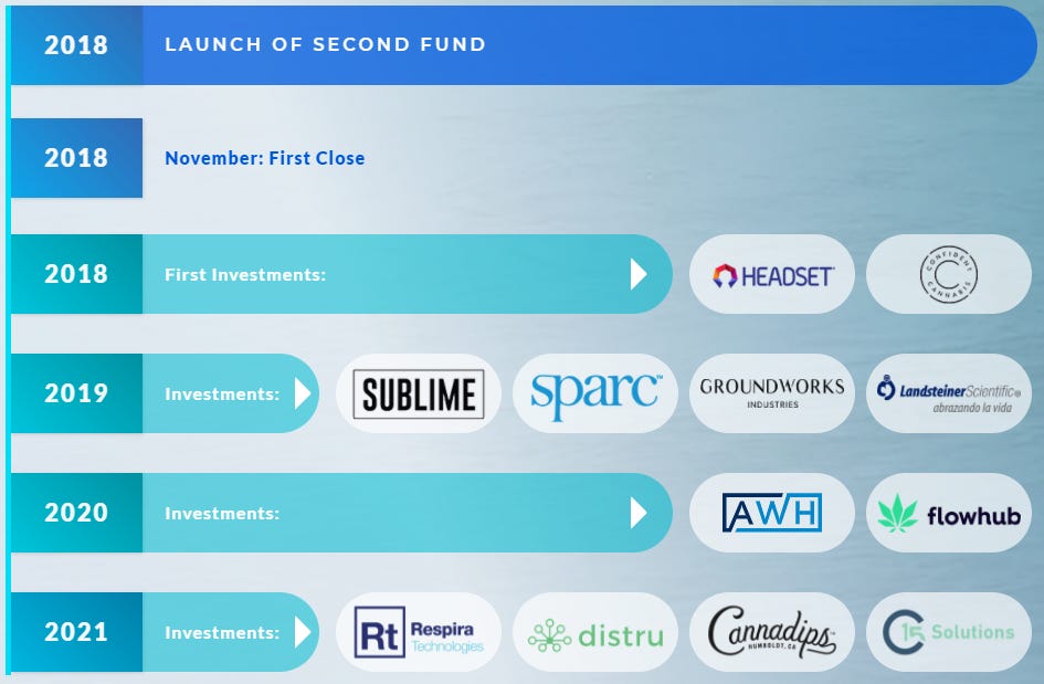 Poseidon has 51 Active Positions. Fund I (Structured as a Hedge Fund) launched in January 2014 and has roughly 38 actively managed portfolio companies, 80% Private, 20% Public. Fund I Portfolio Companies includes: Flowhub, wurk, GTI, Flow Cannabis Co, PAX, BastCore, Clever Leaves, Copperstate Farms, Ascend Wellness, Respira Technologies, Headset, Hara (dba Hemper). Fund II (Series A and later) launched in September 2018 and targets investing in 12-15 portfolio company. Fund II Portfolio Companies includes: Headset, Confident Cannabis, Sublime (exited to Harborside), Sparc, Landsteiner Scientific, Groundworks Industries, Ascend Wellness, Flowhub, Respira Technologies, distru, CannaDips, and C15 Solutions.