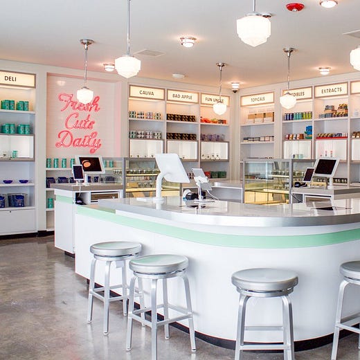 The name of the store is inspired by its Deli weed line that launched in January. The store has an old-fashioned New York deli design concept: mint green color palette, glass window counters displaying different flowers and cafe stools for guests.