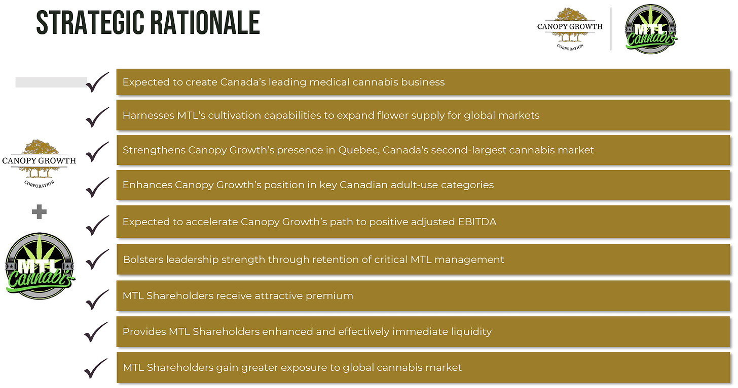 Canopy Growth to acquire MTL Cannabis for ~$179M. Under the terms of the Arrangement Agreement, each shareholder of MTL will receive fixed consideration for each MTL Share equal to: (i) 0.32 of a common share of Canopy Growth and (ii) $0.144 in cash. MTL was founded by Québec-based entrepreneurs and brothers, Richard and Michel Clément, who built the company around a deep commitment to cultivating high-quality cannabis flower. Canopy Growth intends to leverage the expertise of the MTL team as it continues to elevate its cannabis product portfolio. MTL had net revenue of $84 million, 51% GM, and $11M in operating cash flow for the TTM period ended September 30, 2025.
